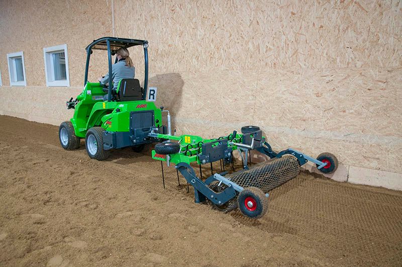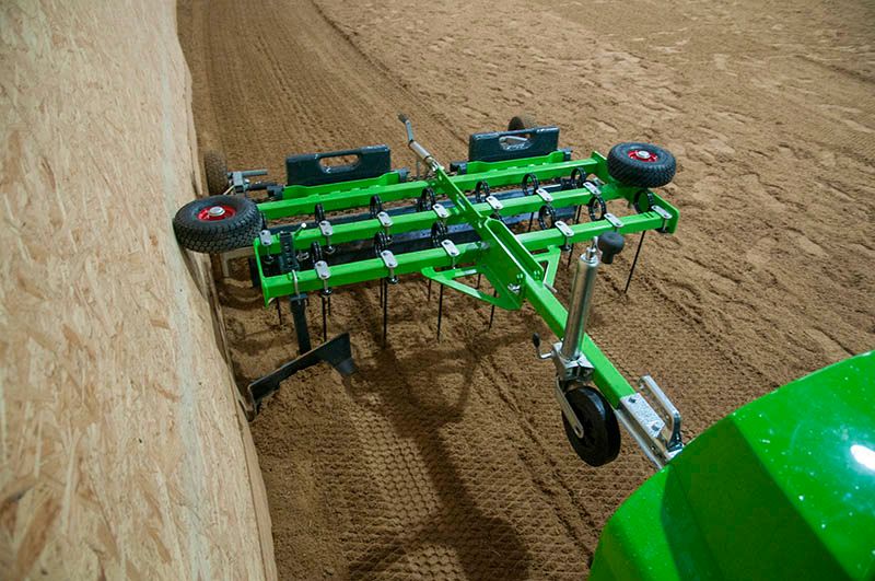 The horse arena harrow is intended for levelling and loosening of horse arena riding surfaces. The harrow has two spring loaded tine rows which loosen the surface, a leveller that makes the surface completely even and a tilling roller that compacts the ground and leaves a finished surface perfectly suited for horse’s hoof. The harrow doesn’t damage the lower levels (understructure) of the riding surface.