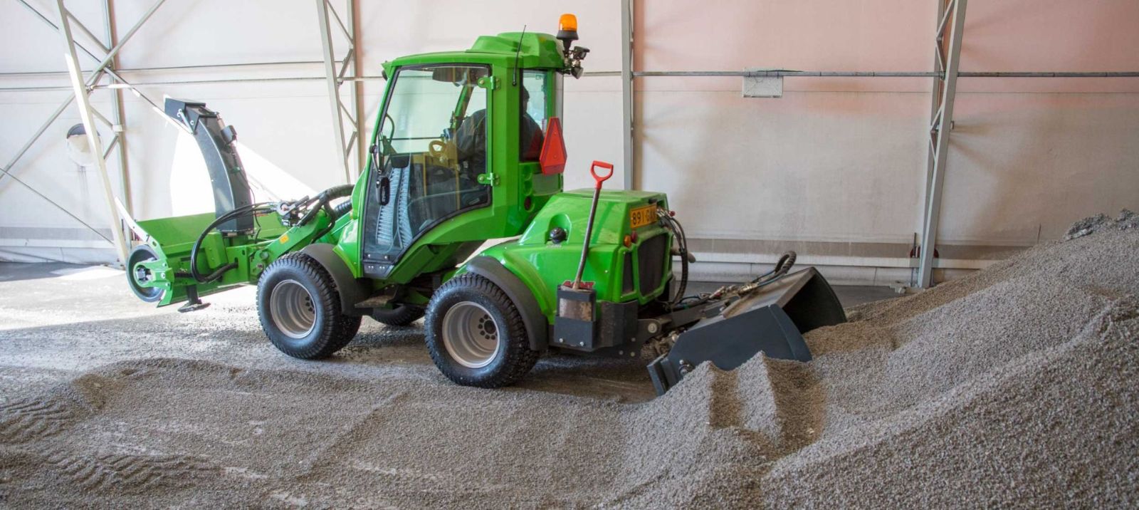 The rear lift can be tilted down max. 95°, which means that the sand spreader can be tilted down to horizontal position and filled directly from the sand pile by reversing with the machine.