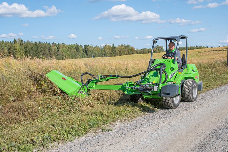 The hydraulic sidearm with S30 quick-attach system can be fitted with attachments with corresponding S30 brackets, for instance, the 1200 mm flail mower. It allows mowing on the right side of the loader. The sidearm is equipped with a straight telescopic arm and a tilting jib arm, which allows easy mowing of road banks and gradients as well.