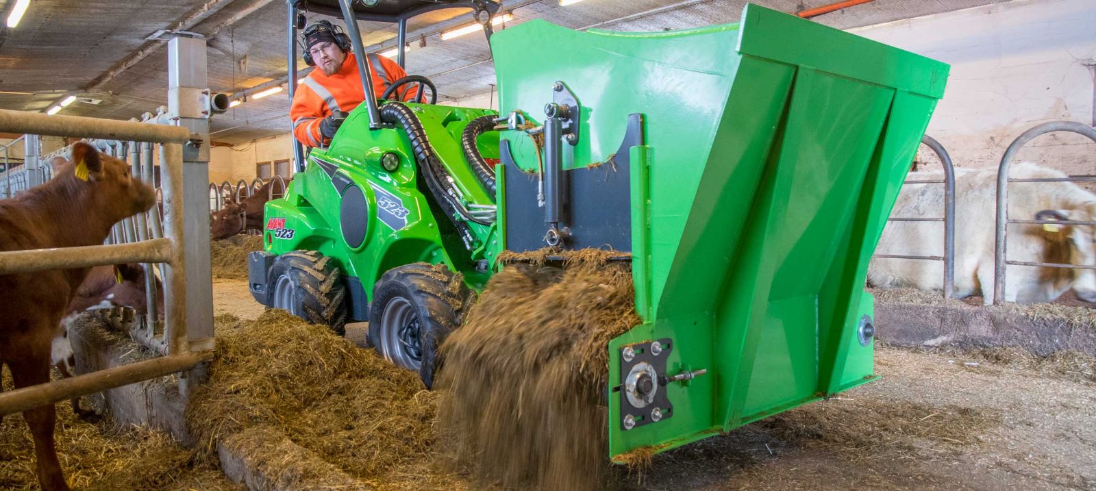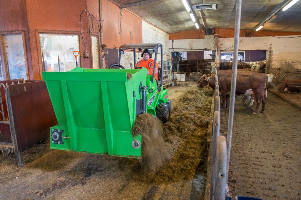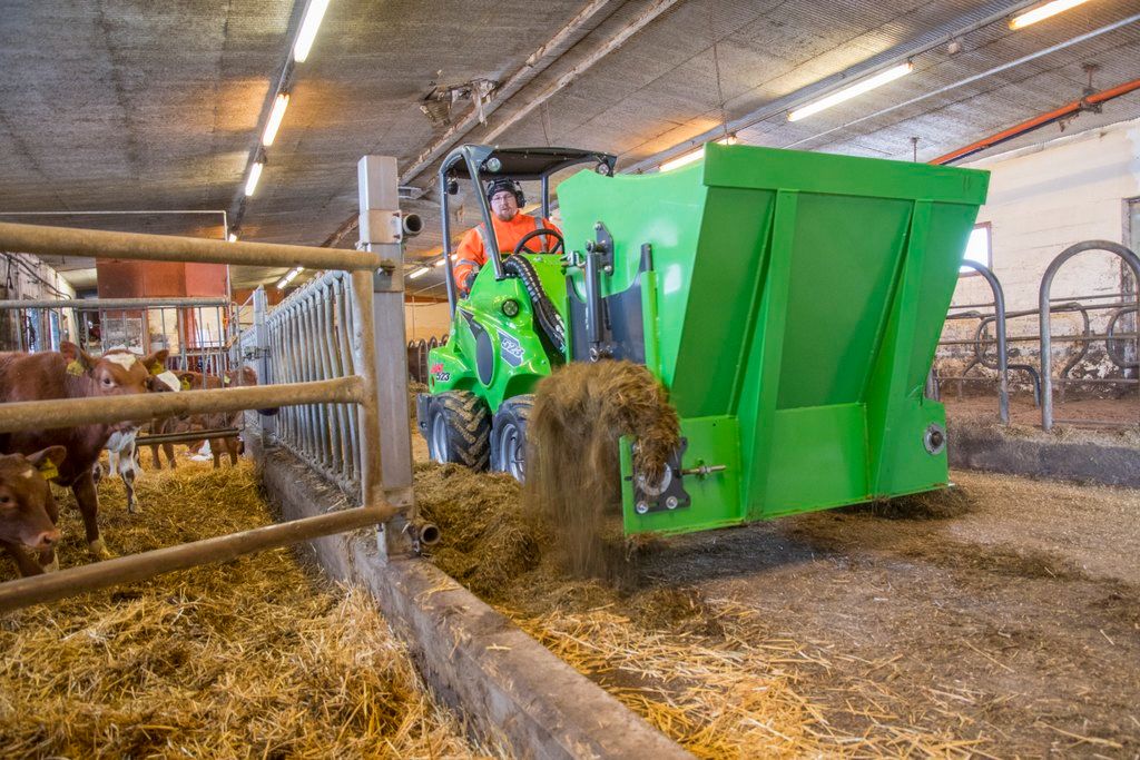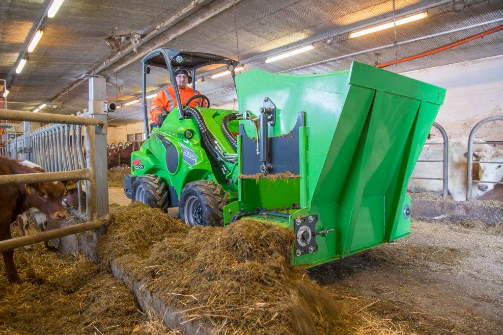 The robust dispenser bucket is equipped with a hydraulically driven elevator in the bottom and discharging to both the right and left side. Especially recommended for precision chopped silage and feeding stuff made with feeder mixers. Adjustable side hatches allow controlled distribution of looser materials like crushed grain as well.