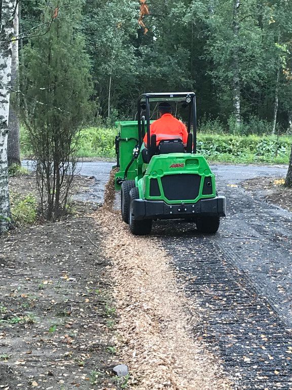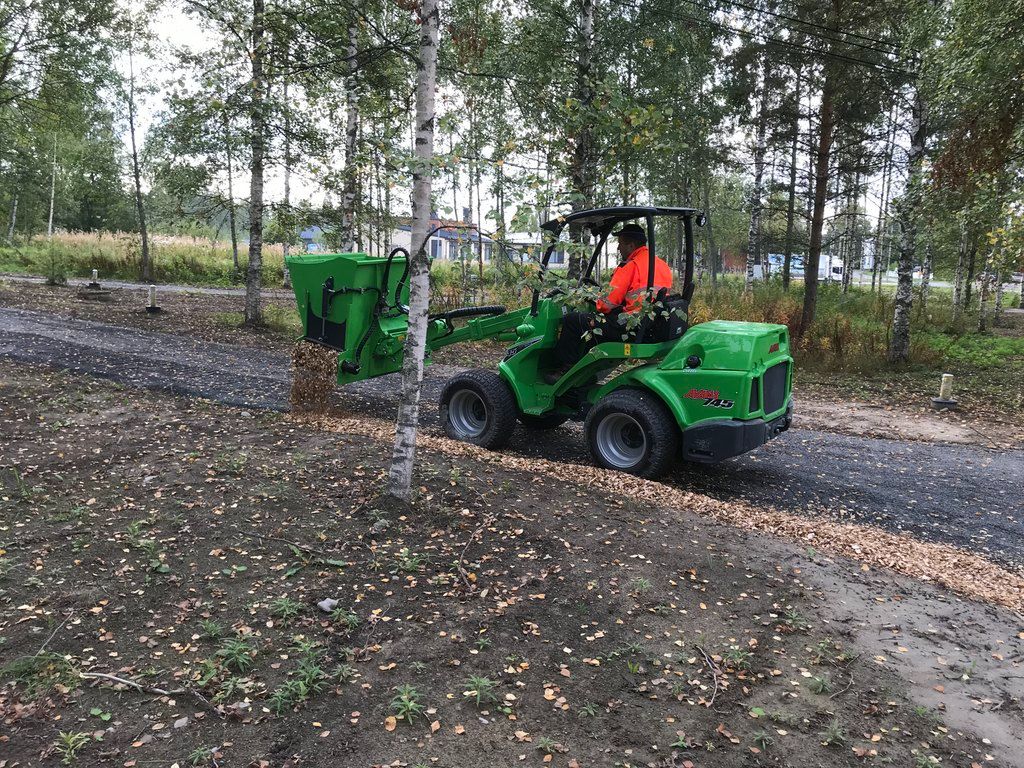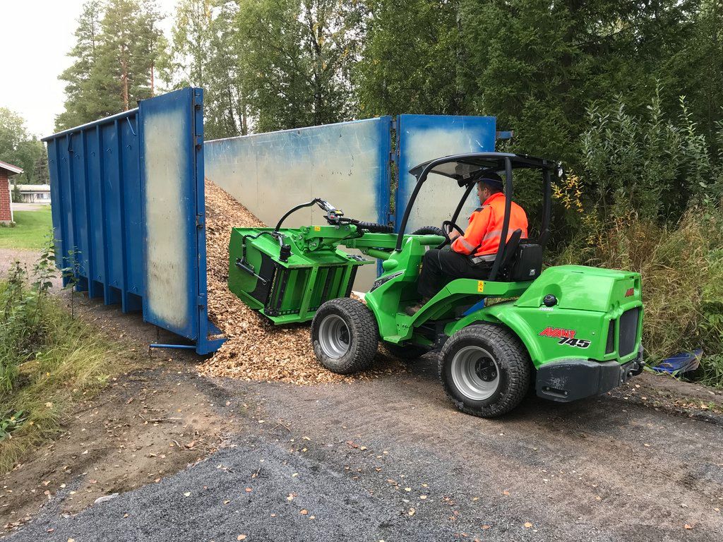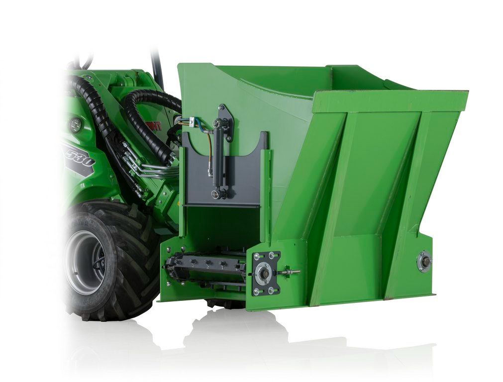 The robust dispenser bucket is equipped with a hydraulically driven elevator in the bottom and discharging to both the right and left side.