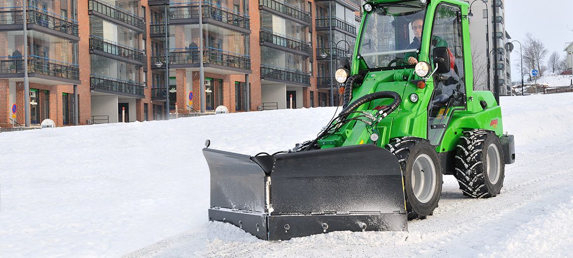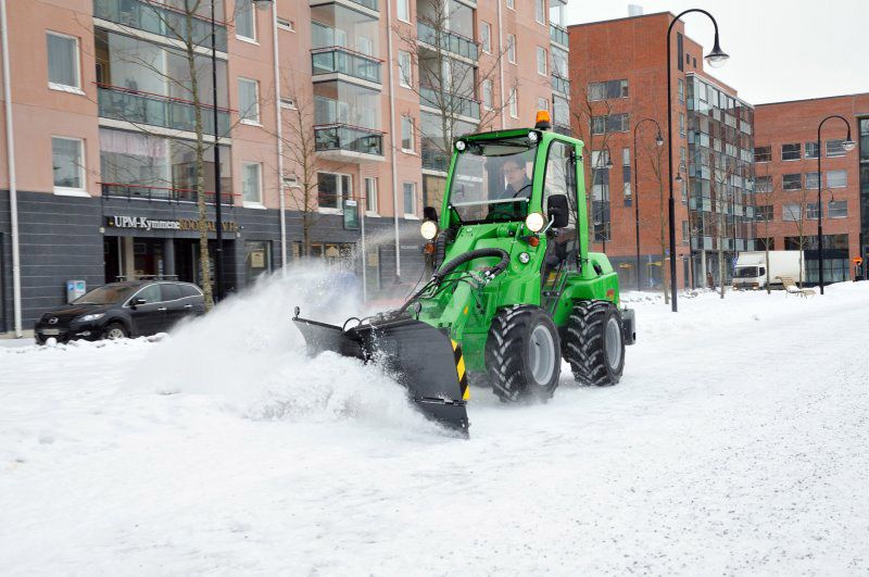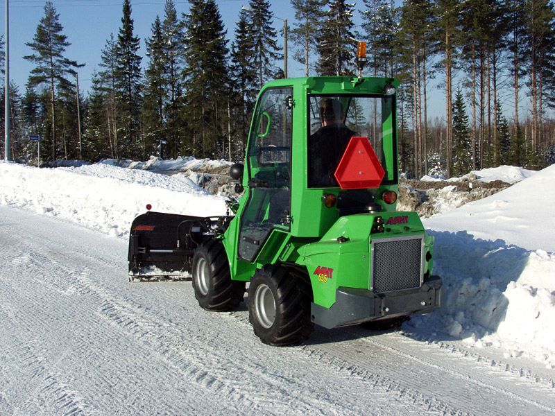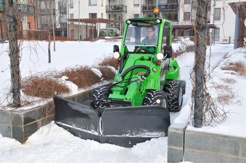 Avant snow plow is a versatile attachment for snow removal. It consists of two independently hydraulically adjustable blades. The angle of the blades is adjusted with a switch from the driver’s seat. Both blades have a spring release mechanism in the lower part of the blade to prevent any sudden stop should the blade hit an obstacle. The floating mechanism on the mounting bracket guarantees that the blade follows the ground as well as possible.