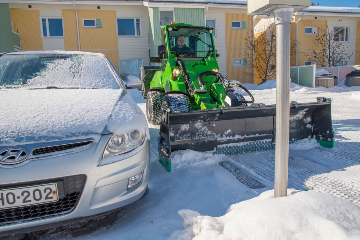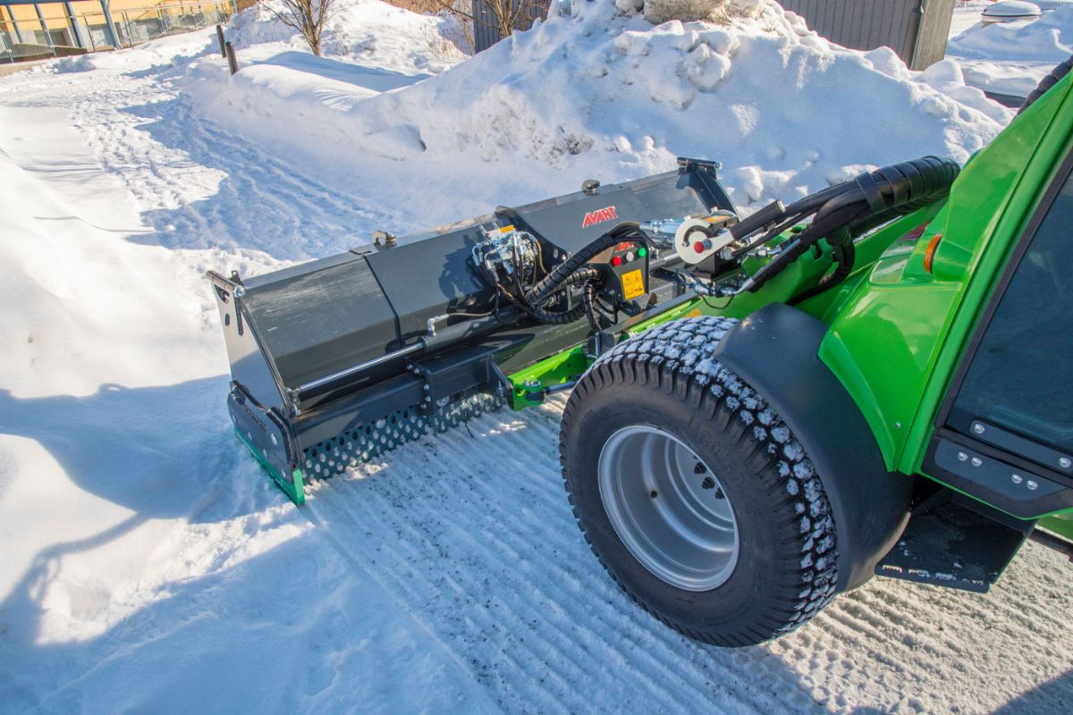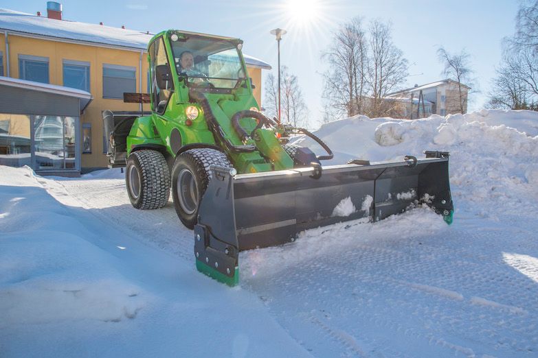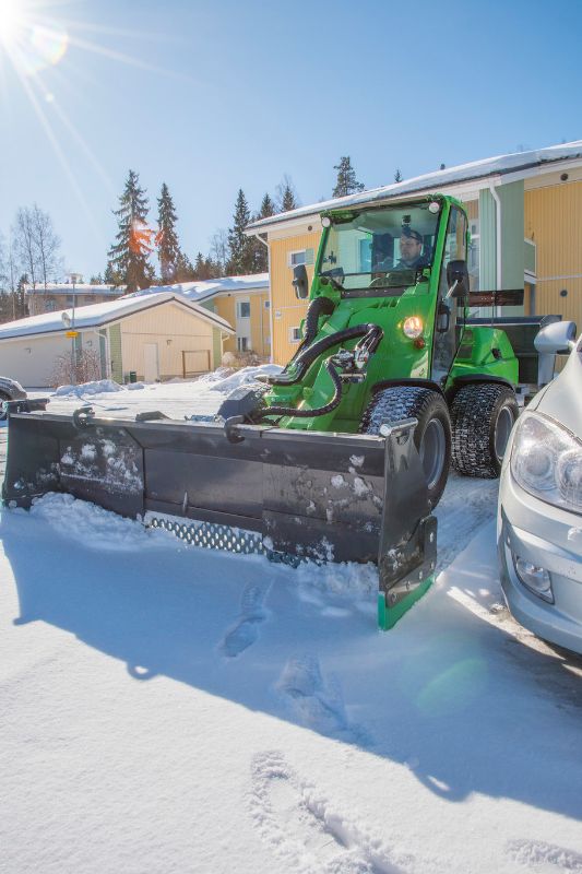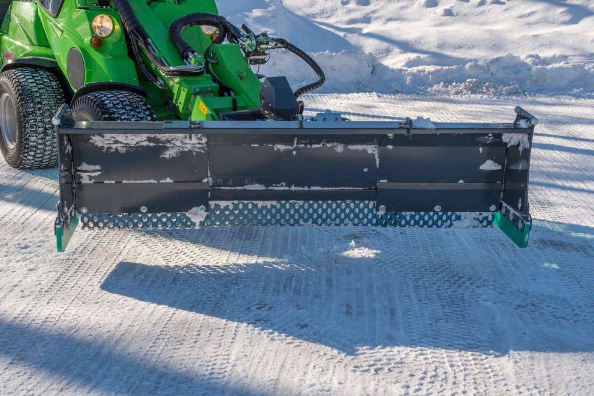 This new type of snow plow is equipped with a straight main blade and two wings which can be extended and retracted steplessly, powered by two hydraulic cylinders. This gives several different working widths and makes the snowplow very versatile. The plow is also equipped with hinged endplates which can be turned down on the ground. This allows fast and efficient snow collecting. When the endplates are turned up over the blade the plow works as a conventional dozer blade and moves snow quickly to the side – and is narrower as well. The endplates are spring loaded which means they follow the contours of the ground well.